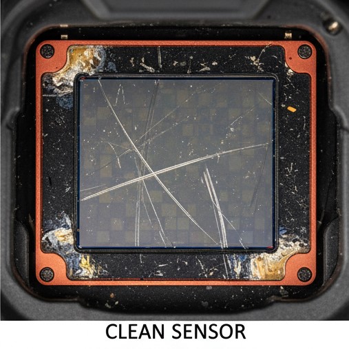 هرگز از وسایل خانگی مانند پنبه، پارچه، یا گوش‌پاک‌کن برای تمیز کردن سنسور استفاده نکنید. الیاف این ابزارها ممکن است درون شاتر گیر کرده یا رطوبت باقی‌مانده باعث اکسید شدن سطح شود.
