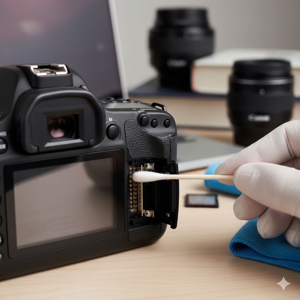 محل تماسهای فلزی باتری و کانکتورهای داخل دوربین را با پارچهی خشک و بدون پرز تمیز کنید.