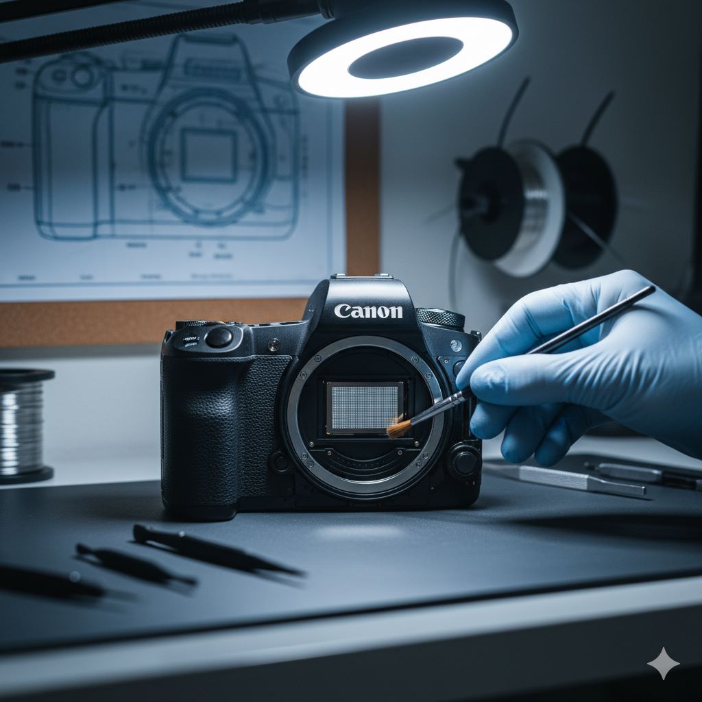 در صورت وجود خراش یا آسیب شدید، تکنسین‌ها فیلتر محافظ را با نمونه اورجینال Canon جایگزین می‌کنند. این فرآیند نیازمند تنظیم دقیق زاویه و فاصله اپتیکی بین فیلتر و سطح سنسور است تا فوکوس و نوردهی دقیق حفظ شود.